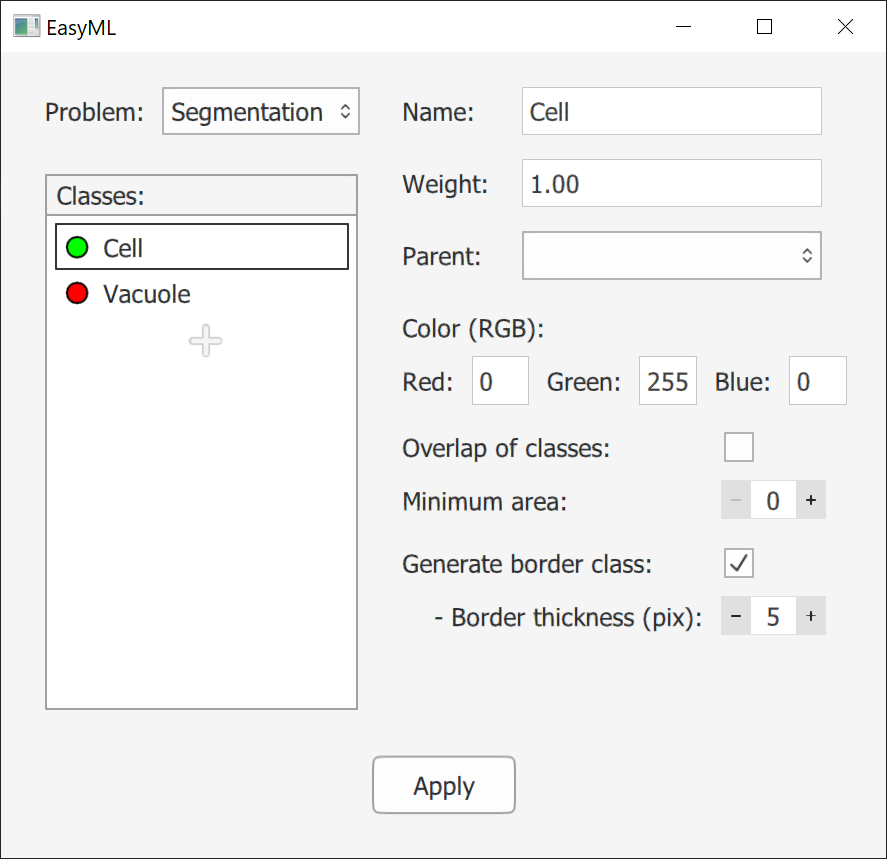 Color (RGB) - RGB color of a class, which should correspond to its color on your images. Uses 0-255 range.
